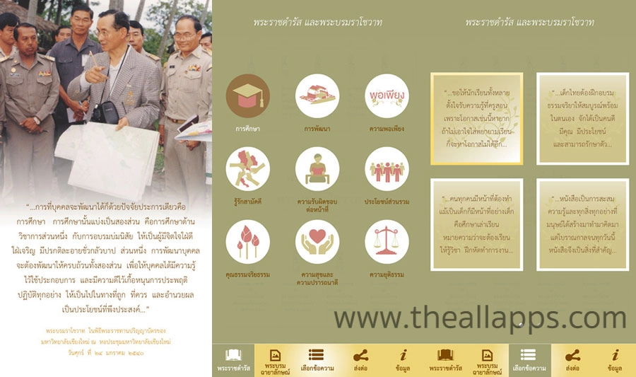 เปรียบแอพฯนี้ได้ว่าเป็นพระราชดำรัสและพระบรมราโชวาทฉบับดิจิตอลเลยก็ว่าได้ โดยจะรวบรวมพระราชดำรัสและพระบรมราโชวาทคัดตัดตอนมาเผยแพร่ให้กับประชาชนทั่วไป เพื่อให้ประชาชนเข้าถึงพระราชดำรัส และพระบรมราโชวาทได้อย่างถูกต้อง เป็นประโยชน์ต่อการนำไปยึดปฏิบัติและสร้างกำลังใจในการดำเนินชีวิต