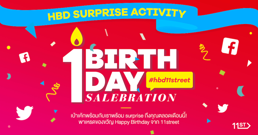11street ชวนแฟนๆ มาร่วมอวยพรวันเกิด พร้อมจัดของขวัญสุดเซอร์ไพรส์มอบให้กับคุณลูกค้า กับกติกาง่ายๆ เพียงคลิก Like หรือ Follow แฟนเพจของ 11street ทั้งทางเฟซบุ๊ก ทวิตเตอร์ และอินสตาแกรม และแชร์โพสต์กิจกรรม #HBD11street ผ่านโซเชียลมีเดียของคุณ