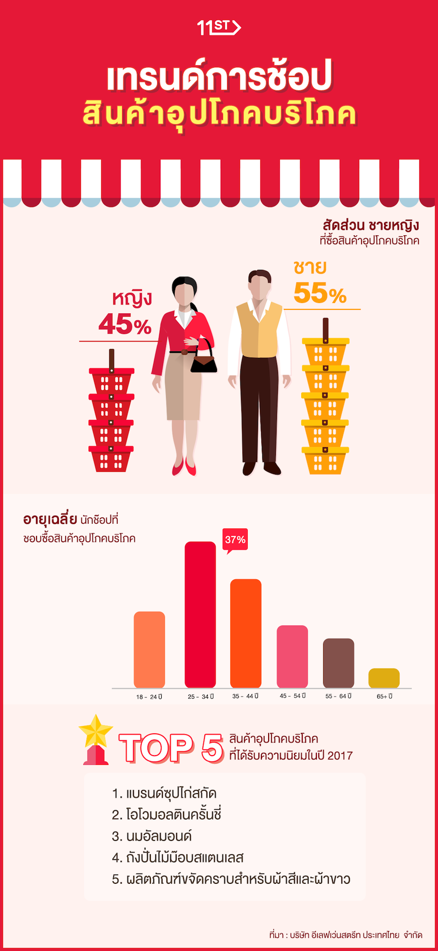 โดยปัจจุบันอีเลฟเว่นสตรีทมีสินค้าให้เลือกช้อปกว่า 9 ล้านรายการ และมีจำนวนผู้ขายกว่า 23,000 ราย และบริษัทฯ พบว่าพฤติกรรมนักช้อปยุคใหม่ต้องการความสะดวก รวดเร็ว และช้อปสินค้าในการราคาสุดคุ้ม หากช่วงที่มีการจัดทำแคมเปญโปรโมชั่นออกมาก็จะเป็นอีกแรงกระตุ้นทำให้ผู้บริโภคหันมาช้อปสินค้าอุปโภคบริโภคผ่านช่องทางออนไลน์กันมากขึ้น โดยเฉลี่ยการซื้อสินค้า 390 บาท /ครั้ง และกลุ่มอายุเฉลี่ย 25 – 34 ปี เป็นกลุ่มที่เข้ามาเลือกช้อปสินค้าอุปโภคบริโภคมากที่สุด โดยสินค้าในกลุ่มที่ได้รับความนิยมในการสั่งซื้อจากอีเลฟเว่นสตรีทในปี 2560 5 อันดับ ได้แก่ 1. แบรนด์ซุปไก่สกัด 2. โอโวมอลตินครั้นชี่ 3. นมอัลมอนด์ 4. ถังปั่นไม้ม๊อบสแตนเลส และ 5. ผลิตภัณฑ์ขจัดคราบสำหรับผ้าสีและผ้าขาว