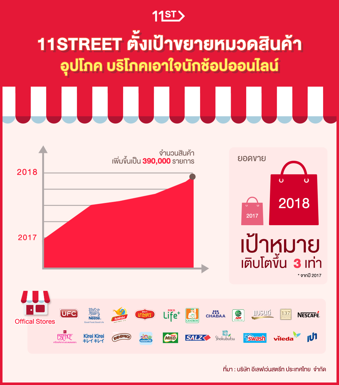 11street จับมือพาร์ทเนอร์รายใหญ่ จับทรนด์พฤติกรรมผู้บริโภคยุคใหม่ที่นิยมช้อปสินค้าอุปโภคบริโภคผ่านช่องทางออนไลน์หรืออีคอมเมิร์ซมากขึ้น รุกขยายตลาดสินค้าอุปโภคบริโภคให้มีสินค้าหลากหลายเพิ่มมากขึ้น โดยตั้งเป้ายอดขายเฉพาะสินค้าในกลุ่มอุปโภคบริโภคเติบโตขึ้น 3 เท่า จากปี 2560 และเพิ่มจำนวนสินค้าอุปโภคบริโภคมากขึ้นเป็น 390,000 รายการ