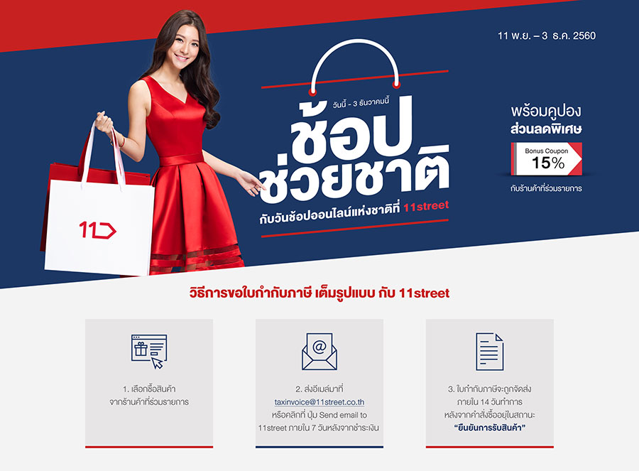 11street ให้นักช้อปได้ช้อปสุดคุ้มยิ่งกว่า และช่วยกระตุ้นโครงการ ‘ช้อปช่วยชาติ ปี 2560’ ของรัฐบาล กับโปรโมชั่น “ช้อปช่วยชาติ” ที่มอบโบนัสคูปอง 15% ให้นักช้อปดาวน์โหลดเพื่อไปใช้เป็นส่วนลดเพิ่มได้ (สำหรับสินค้าจากร้านค้าที่ร่วมรายการเท่านั้น)