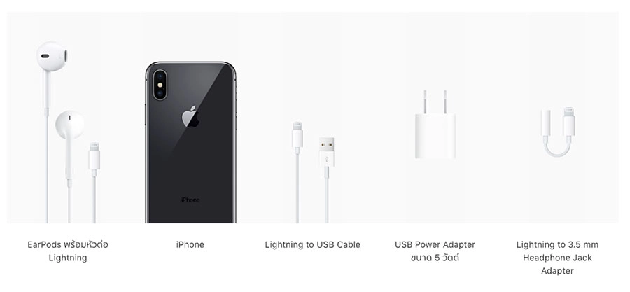 สิ่งที่มาในกล่องได้แก่ iPhone X, EarPods พร้อมหัวต่อ Lightning, Lightning to USB Cable, USB Power Adapter ขนาด 5 วัตต์ และ Lightning to 3.5 mm Headphone Jack Adapter