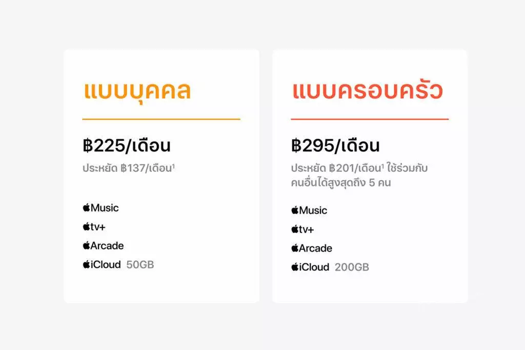 - Family (แบบครอบครัว) ประกอบด้วย Apple Music, Apple TV+, Apple Arcade และพื้นที่จัดเก็บข้อมูล iCloud ขนาด 200 GB ในราคา 295 บาทต่อเดือน และสามารถแชร์ภายกับสมาชิกในครอบครัวได้สูงสุด 5 คน