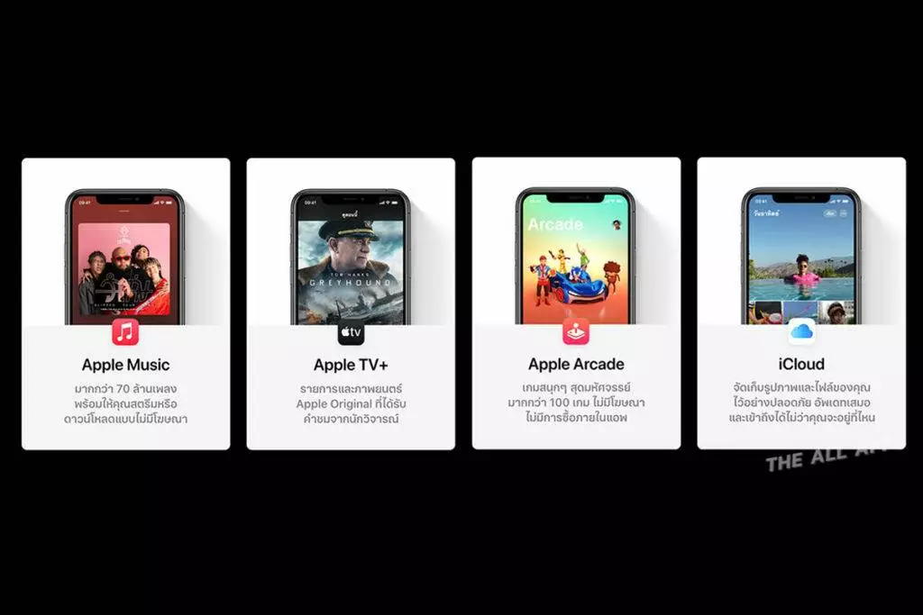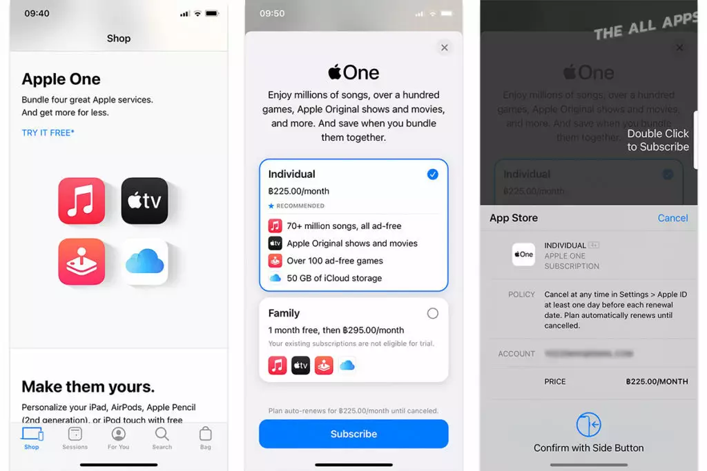 - Individual (แบบบุคคล) ประกอบด้วย Apple Music, Apple TV+, Apple Arcade และพื้นที่จัดเก็บข้อมูล iCloud ขนาด 50 GB ในราคา 225 บาทต่อเดือน