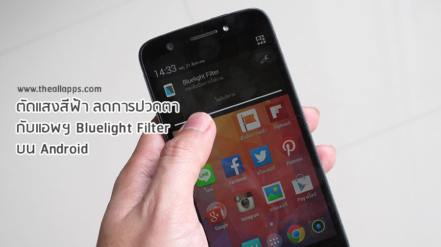 นอกจากนี้ Bluelight Filter ยังมีฟิลเตอร์ให้เลือกใช้งานถึง 5 สี และเปิด/ปิดแอพฯได้ง่าย ด้วยการเปิด/ปิดจากแถบของ Notifications Bar ที่สามารถลากลงมาจากด้านบนของหน้าจอได้ตลอดเวลา