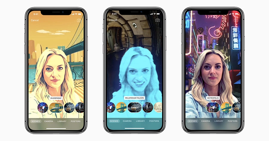 Selfie Scenes คือคุณสมบัติใหม่ที่จะพาผู้ใช้งานเข้าไปอยู่ในฉากแอนิเมชั่นแบบ 360 องศา ขณะอัดวิดีโอเซลฟี่ โดยจะใช้ร่วมกับกล้อง TrueDepth บน iPhone X เซลฟีและสามารถเลือกฉากหลังเป็นเมืองที่วุ่นวาย ธรรมชาติอันแสนสงบ ภาพวาดแอ็บสแตรกต์ หรือแม้แต่ในยาน Millenium Falcon และ Mega-Destroyer จากเรื่อง “Star Wars: The Last Jedi”