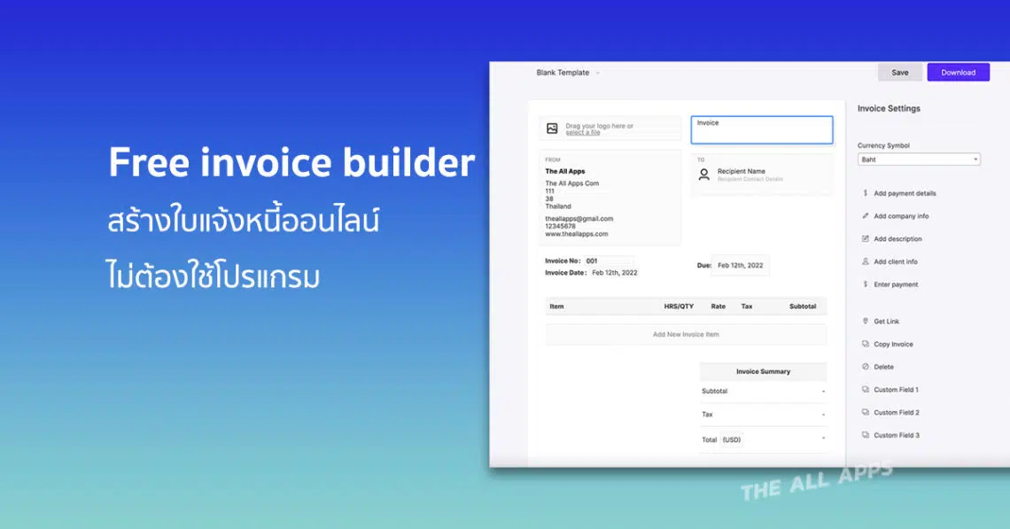โดยสามารถใส่ Logo ของบริษัท, เลือกแบบฟอร์มว่าจะเป็น Invoice หรือ Receipt (ใบเสร็จรับเงิน) ที่มักจะมีการใช้งานกันบ่อยๆ และก็มีเท็มเพลตให้กรอกข้อมูลที่จพเป็นอย่างง่ายดาย รวมถึงการเลือกสกุลเงินที่รองรับเงินบาทไทย (Baht) ได้ ซึ่งเราสามารถเลือกใส่รายละเอียดการชำระเงินต่างๆ ได้อีกด้วย และสามารถดาวน์โหลดมาใช้งานได้ทันที