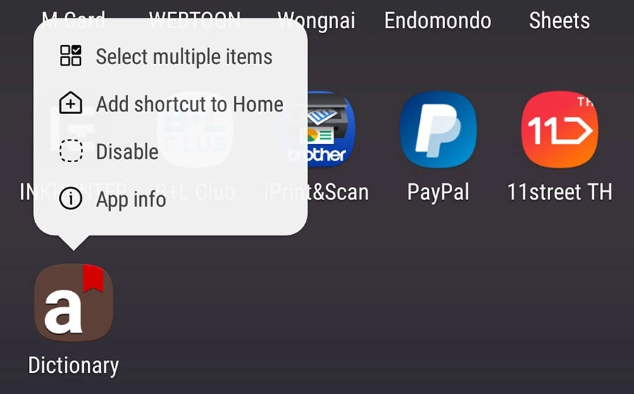 1.เช็คความพร้อม เข้าไปที่ Settings > Apps เลื่อนดู Dictionary หากเป็นขึ้น Enable ก็ให้ทำการเปิดใช้งานเสียก่อน ส่วนถ้าขึ้นคำว่า Disable ก็แสดงว่ามีการเปิดใช้งานแล้ว