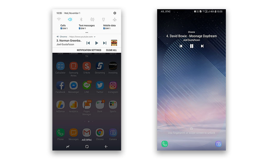 - หลังจากนั้นเมื่อคุณกดปุ่มโฮมหรือเข้าแอปพลิเคชันอื่น เพลงจะหยุดเล่น ให้ลากแถบแจ้งเตือน Notifications ลงมา เราก็จะเห็นแถบควบคุมเล่นเพลง เราสามารถกดเล่นเพลงได้ต่อจากแถบควบคุมนี้ และคราวนี้ก็สามารถล็อคหน้าจอ หรือเปลี่ยนไปใช้งานแอปพลิเคชั่นอื่นต่อได้เลย