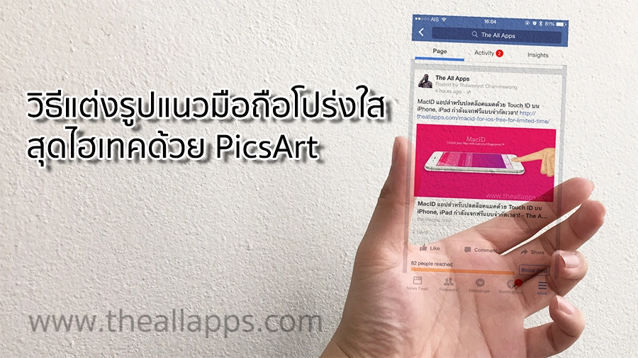 เราเริ่มเห็นรูปภาพที่ตกแต่งเป็นมือถือสมาร์ทโฟนสุดไฮเทคที่มีความโปร่งใสตามโซเชี่ยลกันบ้างแล้ว วันนี้ The All Apps จะมาแนะนำวิธีทำภาพเหล่านี้ด้วยแอปพลิเคชั่น PicsArt กันครับ