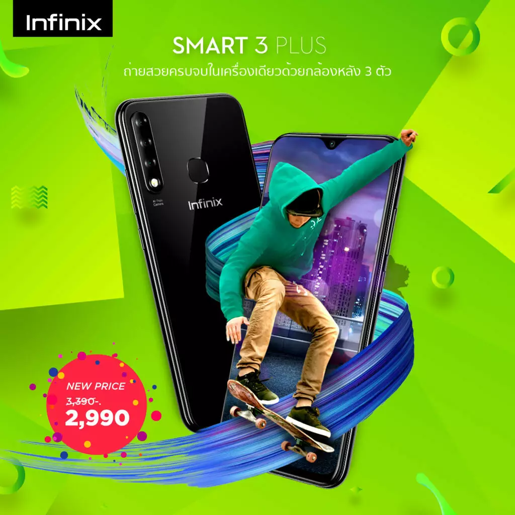 Infinix Smart 3 Plus ประกาศปรับราคาจากเดิม 3,390 บาท เหลือเพียง 2,990 บาท ถ่ายสวยครบจบในเครื่องเดียว ด้วยกล้องหน้าความละเอียด 8 ล้านพิกเซล เพื่อภาพเซลฟี่สวยเนียนเป็นธรรมชาติ กล้องหลัง 3 ตัว แบบ Triple-Camera ที่จับโฟกัส และปรับระยะ เพื่อให้ได้ภาพโบเก้แบบหน้าชัดหลังเบลอที่สมบูรณ์แบบ จอใหญ่ 6.2 นิ้ว ดีไซน์แบบหยดน้ำ ที่ให้ความคมชัดระดับ HD แบตเตอรี่ก็มีความจุมากถึง 3500 มิลลิแอมป์ ตอบโจทย์การใช้งานได้ยาวนานตลอดทั้งวัน รองรับการเชื่อมต่ออินเทอร์เน็ตผ่านระบบ 4G LTE พร้อมรองรับเทคโนโลยี Dual 4G ตัวเครื่องเน้นความเรียบหรูแบบมิลเลอร์ดีไซน์ ฝาหลังโค้งมนจับได้ถนัดมือพร้อมบริการหลังการขายแบบ รับ-ส่งเครื่อง ถึงบ้าน