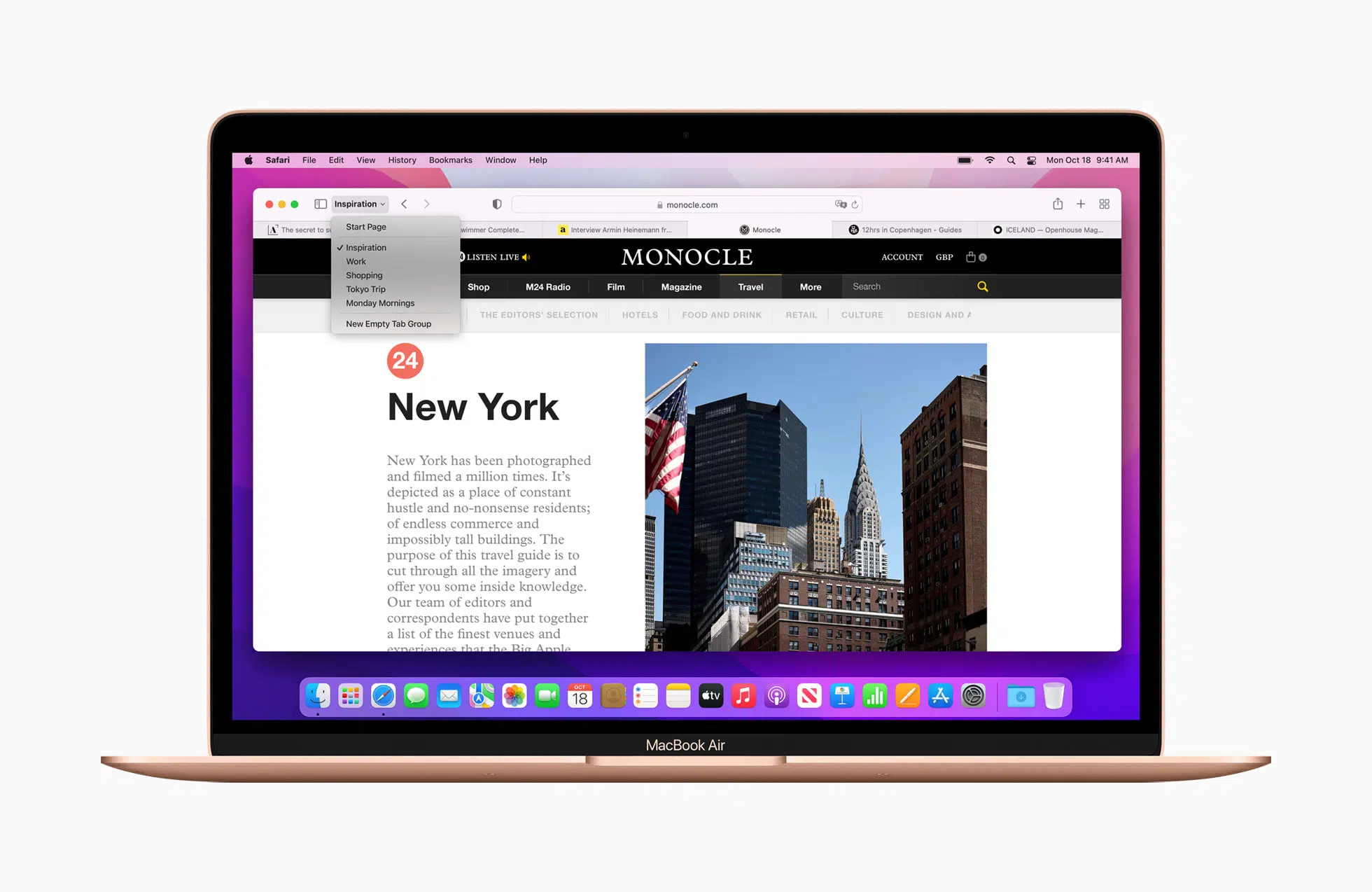 Safari ช่วยให้ผู้ใช้ควบคุมการท่องเว็บได้ดียิ่งขึ้น เพราะมี “กลุ่มแถบ” หรือ Tab Groups ที่ช่วยให้ผู้ใช้สามารถบันทึกและจัดระเบียบแถบต่างๆ ได้ง่าย เหมาะสำหรับการวางแผนทริป ค้นคว้าข้อมูล และจัดเก็บแถบที่เปิดบ่อย นอกจากนี้ “กลุ่มแถบ” ยังซิงค์กันทั้งบน Mac, iPhone และ iPad ผู้ใช้จึงสามารถทำโปรเจ็กต์ต่อได้จากทุกที่หรือแชร์แถบเว็บไซต์เหล่านั้นกับเพื่อนๆ และครอบครัวได้ Safari มาพร้อมวิธีใหม่ๆ ในการสัมผัสประสบการณ์บนเว็บ ไม่ว่าจะเป็นแถบเว็บไซต์ในดีไซน์ใหม่ที่กะทัดรัด ซึ่งช่วยให้ผู้ใช้มีพื้นที่ในการท่องเว็บมากขึ้น และยังทำงานร่วมกับคุณสมบัติ “แชร์กับคุณ” ที่ให้ผู้ใช้ดูลิงก์ต่างๆ ที่ส่งมาทางข้อความได้ง่าย ทั้งยังรองรับ “โน้ตด่วน” ที่ช่วยให้การติดตามข้อมูลที่พบบนเว็บไซต์เป็นเรื่องง่าย และ Safari ยังปกป้องความเป็นส่วนตัวของผู้ใช้มากยิ่งขึ้นด้วยคณสมบัติ “การป้องกันการติดตามอัจฉริยะ” ที่วันนี้ช่วยป้องกันไม่ให้ผู้ติดตามสร้างโปรไฟล์เกี่ยวกับตัวผู้ใช้จากที่อยู่ IP
