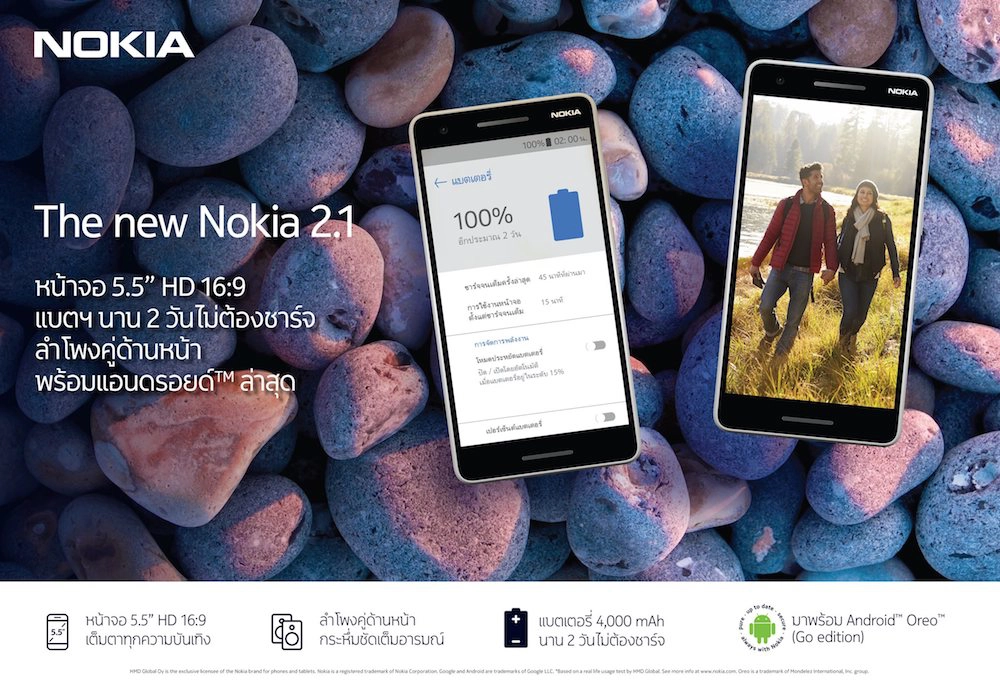 HMD Global เจ้าของลิขสิทธิ์การจัดจำหน่ายสมาร์ทโฟน แบรนด์โนเกียทั่วโลกแต่เพียงผู้เดียว ประกาศเปิดตัวสมาร์ทโฟน new Nokia 2.1 อย่างเป็นทางการแล้ว ในประเทศไทย พร้อมวางจำหน่ายที่ร้านค้าและตัวแทนจำหน่ายทั่วประเทศตั้งแต่วันนี้เป็นต้นไป ในราคา 3,390 บาท
