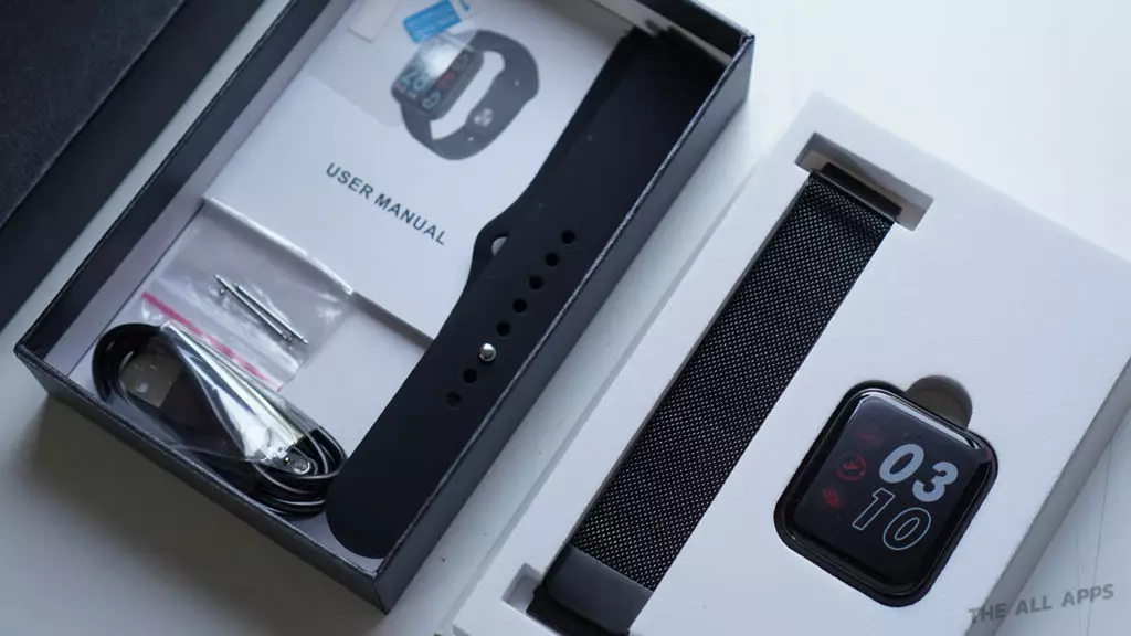 เมื่อเปิดขึ้นอีกชั้นก็จะพบกับสายซิลิโคนสำหรับใส่ออกกำลังกาย พร้อมกับแกนเหล็กสำหรับใช้งานกับสายเหล็ก อีกทั้งยังมีฟิล์มกันรอยหน้าจอมาให้ใช้งานกันด้วย