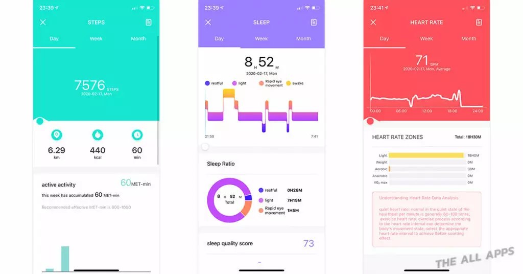 ในหน้าแรกจะเป็นการบอกข้อมูลของวันที่ ณ ปัจจจุบัน โดยจะมีข้อมูลจำนวนก้าวเดิน, การนอนหลับ, อัตราการเต้นของหัวใจ และข้อมูลการออกกำลังกาย ทั้งนี้สามารถเข้าเพื่อดูรายละเอียดเพิ่มเติมได้และเลือกดูตามวันอื่นๆ ได้อีกด้วย