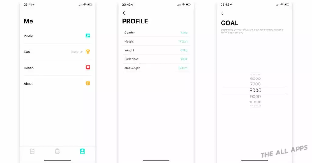 หน้าสุดท้ายจะเป็นการตั้งค่าเกี่ยวกับผู้ใช้งาน อาทิ เพศ, วันเดือนปีเกิด, ส่วนสูง, น้ำหนัก และเป้าหมายจำนวนก้าวเดินในแต่ละวัน ซึ่งหากเรากรอกข้อมูลที่เป็นตามจริง ก็จะช่วยในเรื่องของการคำนวณได้แม่นยำมากขึ้น