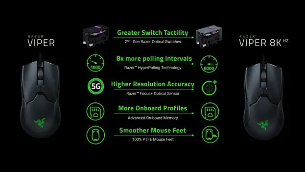 Viper 8KHz เป็นอุปกรณ์ต่อพ่วง Razer รุ่นแรกที่มีเทคโนโลยี Razer HyperPolling โดยผสานนวัตกรรมหลัก 3 อย่างไว้ในอุปกรณ์เดียวเพื่อสร้างเมาส์สำหรับเล่นเกมที่เร็วที่สุดในโลก สวิตช์เมาส์ออปติคัล Razer รุ่นที่ 2 และเซ็นเซอร์ออปติคัล Razer Focus รวมกับเทคโนโลยี Razer HyperPolling มอบเมาส์สำหรับเล่นเกมที่มีความเร็วความแม่นยำและการตอบสนองที่เหนือชั้น