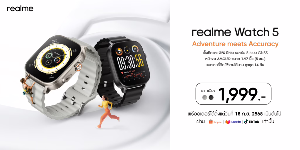 พร้อมเติมเต็มไลฟ์สไตล์วัยรุ่นด้วย Gadget ใหม่ล่าสุดอย่าง realme Watch 5 สมาร์ทวอทซ์ที่จะเป็นผู้ช่วยในชีวิตประจำวัน ด้วยเข็มทิศและ GPS อิสระ รองรับ 5 ระบบ GNSS มองชัดเต็มตาด้วยหน้าจอ AMOLED ขนาด 1.97 นิ้ว และใช้งานได้ยาวนานสูงสุด 14 วัน และ realme Buds T200 ตัดเสียงรบกวน เปิดโลกเสียงคุณภาพ ด้วยไดนามิกเบส 12.4 มิลลิเมตร พร้อมตัดเสียงรบกวนแบบแอคทีฟ 32dB ใช้งานต่อเนื่องได้ยาวนาน 50 ชั่วโมง มอบประสบการณ์ความบันเทิงและการเชื่อมต่อที่ครบครันยิ่งกว่าเดิม