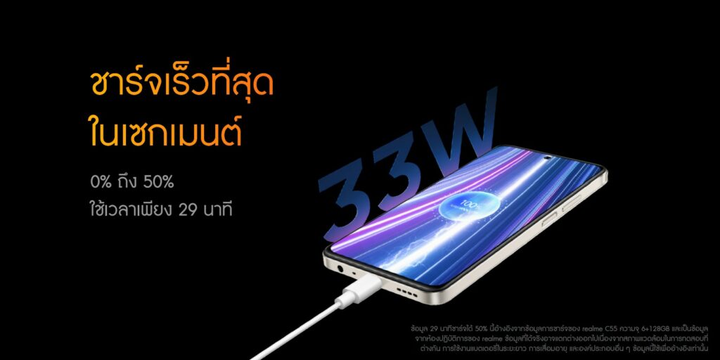 เรียลมีเข้าใจถึงไลฟ์สไตล์ของชีวิตยุคใหม่ จึงใส่เทคโนโลยีระบบชาร์จเร็ว 33W SUPERVOOC สามารถชาร์จแบตเตอรี่ขนาด 5000mAh จาก 0-100% ในเวลาเพียง 63 นาที ผู้ใช้งานจึงไม่ต้องกังวลเรื่องประสิทธิภาพการใช้งานระหว่างวัน