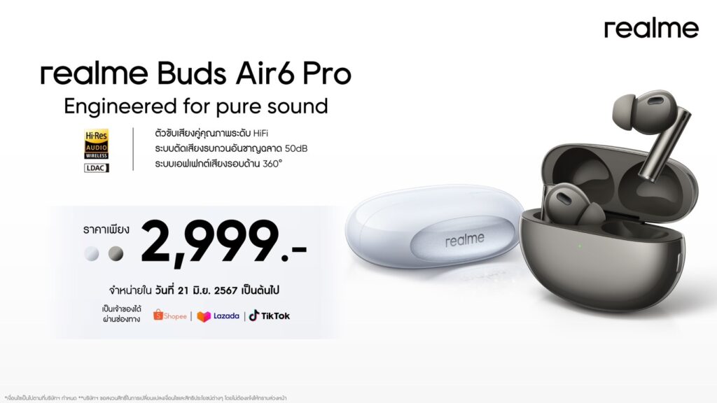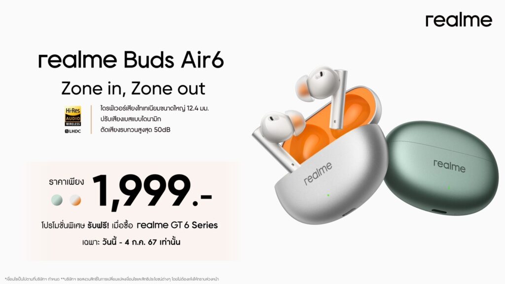 realme Buds Air6 series นำเสนอทั้ง realme Buds Air6 และ Pro Buds Air6 Pro โดย realme Buds Air6 เปิดตัวในราคา 1,999 บาท พรัอมโปรโมชั่นพิเศษ รับ realme Buds Air 6 ฟรีทันที! เมื่อซื้อ realme GT 6 Series เฉพาะวันนี้ – 4 กรกฎาคมเท่านั้นผ่านช่องทาง realme Brand Shop และตัวแทนจำหน่ายที่กำหนด