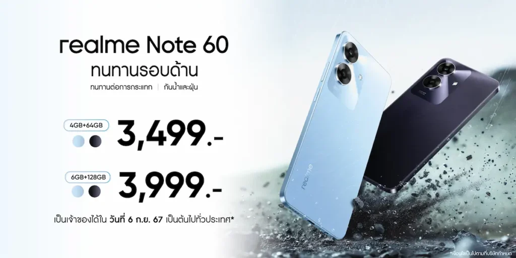 realme (เรียลมี) แบรนด์สมาร์ตโฟนเพื่อคนรุ่นใหม่ที่เติบโตเร็วที่สุดในโลก เปิดตัวบัดเจ็ตโฟนรุ่นใหม่ล่าสุด “realme Note 60” พร้อมสร้างมาตรฐานใหม่ทั้งในด้านความแข็งแรงทนทานและประสิทธิภาพการใช้งานในตลาดสมาร์ตโฟนระดับ Entry-level ชูไฮไลต์กลไกปฏิวัติวงการ ArmorShell™ Protection ที่ได้รับการออกแบบเพื่อมอบความแข็งแกร่งทนทานอย่างเหนือชั้น พร้อมเติมเต็มประสบการณ์ระดับพรีเมียมที่เหนือล้ำกว่าทุกความคาดหวังของคุณ เปิดราคาในตลาดเมืองไทยอย่างเป็นทางการเริ่มต้นที่ 3,499 บาท พร้อมให้คุณเป็นเจ้าของได้ที่ realme Brand Shop ทุกสาขาและศูนย์จำหน่ายสมาร์ตโฟนชั้นนำทั่วประเทศตั้งแต่ 6 กันยายน เป็นต้นไป
