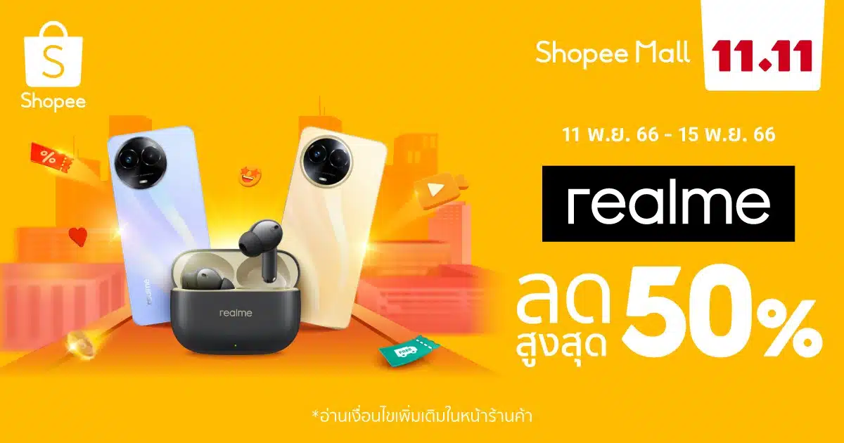 ช้อปปี้ ผู้นำแพลตฟอร์มอีคอมเมิร์ซในภูมิภาคเอเชียตะวันออกเฉียงใต้และไต้หวัน จัดแคมเปญลดใหญ่ส่งท้ายปี Shopee 11.11 ลด ใหญ่ มาก ดึงแบรนด์เทคโนโลยีเพื่อคนรุ่นใหม่อย่าง realme (เรียลมี) ส่ง 4 ไอเท็มใหม่ ร่วมแคมเปญด้วยดีลสุดพิเศษการันตีถูกชัวร์ด้วยโปรเด็ด ให้ลูกค้าชาวไทยได้เป็นเจ้าของสมาร์ทโฟนและแกดเจ็ตได้ง่ายๆ ตั้งแต่วันที่ 6 พฤศจิกายน – 15 พฤศจิกายน 2566