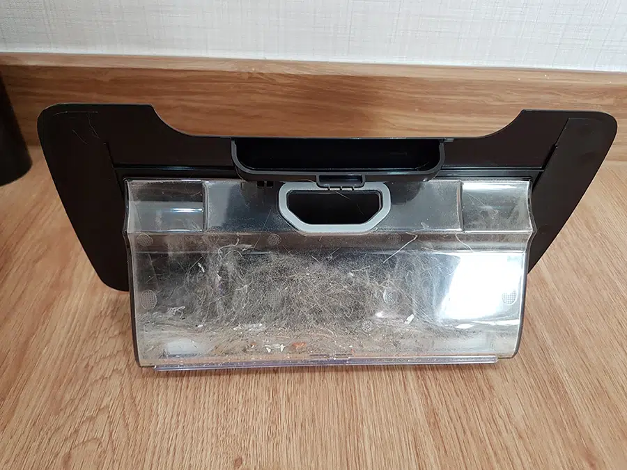 สำหรับฝุ่น ขนสัตว์ เส้นผม เศษขนมต่างๆ ก็จะถูกเก็บในกล่องเป็นอย่างดี เมื่อทำความสะอาดเสร็จ เราก็เพียงแค่ถอดกล่องนี้ออกไปเททิ้งเท่านั้น และถ้าต้องการทำความสะอาดแปรงกวาด ก็เพียงแค่ถอดแปรงด้านข้างออกก่อน และดึงหน้ากากสีดำออกได้เลย จากนั้นก็สามารถถอดแปรงกวาดออกมาทำความสะอาดในกรณีที่เส้นผมไปพันได้