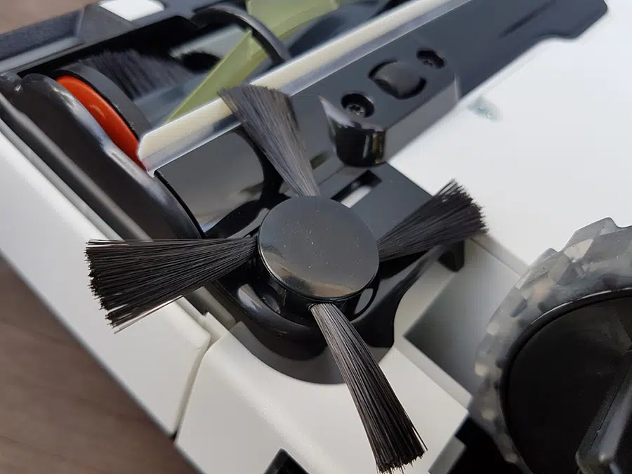 ถัดลงมาเป็นแปรงด้านข้างช่วยในการทำความสะอาดตามขอบ ซึ่งมีเพียงข้างเดียวหากเทียบกับหุ่นยนต์ดูดฝุ่นรุ่นอื่นๆ มักจะมีแปรงด้านข้างถึง 2 ฝั่ง แต่สำหรับรุ่นนี้ด้วยตัวเครื่องเป็นรูปตัว D และถูกออกแบบมาให้ใช้ด้านที่มีแปรงนั้นเดินเลาะติดกำแพงอยู่ฝั่งเดียว จึงไม่จำเป็นต้องมีแปรงด้านข้างถึง 2 ฝั่ง