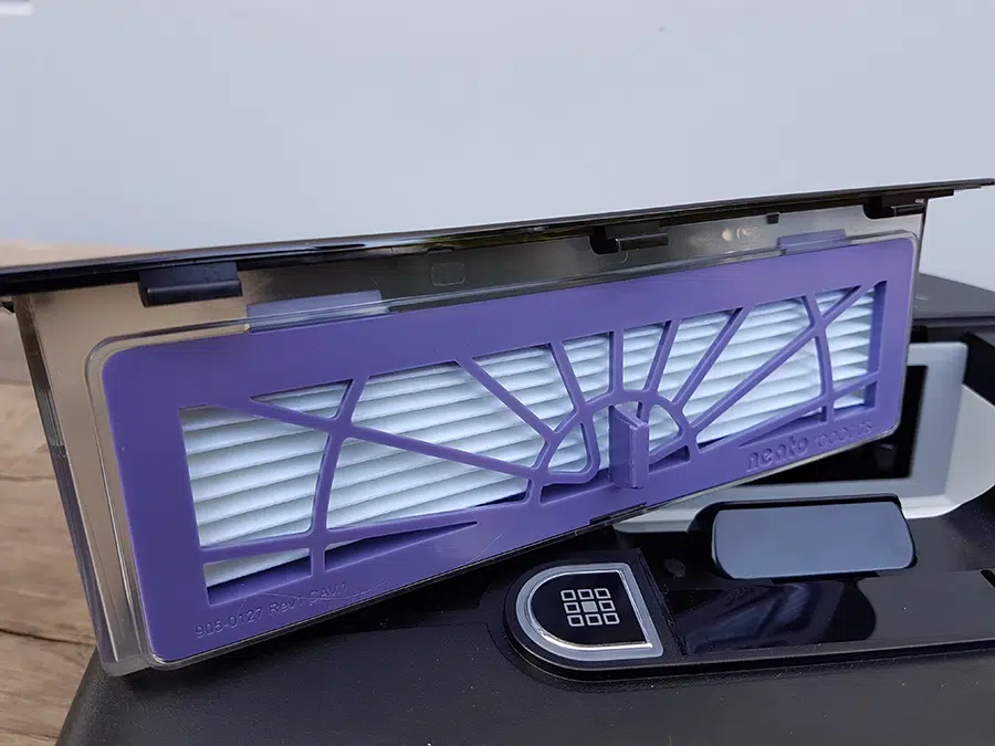 เมื่อเปิดขึ้นมา ตรงส่วนนี้ก็จะเป็นกล่องสำหรับเก็บเศษฝุ่น เส้นผม ที่ตัวเครื่องดูดขึ้นมา พร้อมกับแผ่นกรองฝุ่น HEPA คุณภาพสูงที่กันไม่ให้ฝุ่นที่ดูดเข้าไปนั้นออกมาจากเครื่องอีกรอบ