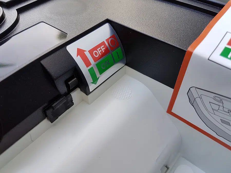 ก่อนการใช้งานดูดฝุ่นจะต้องทำการเปิดสวิตช์ภายในเครื่องเสียก่อน (On) ซึ่งเครื่องที่มาจากการแกะกล่องก็จะมีสติ๊กเกอร์แปะอธิบายไว้อยู่ ว่าเลื่อนลงเป็นเปิด เลื่อนขึ้นเป็นปิดการใช้งาน