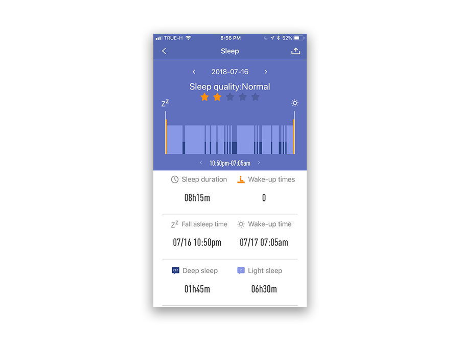 การนอนหลับ ก็จะแสดงผลการหลับลึก, หลับตื้น และช่วงที่ตื่น ว่าแต่ละช่วงใช้เวลาไปเท่าไร พร้อมกันนี้ยังมีการให้คะแนนดาวสำหรับคุณภาพการนอนหลับอีกด้วย ยิ่งหลับลึกบ่อย และมีรอบการหลับลึก 3-4 ครั้งต่อคืน นั่นหมายมีการนอนหลับที่ดี การนอนหลับที่ดี ก็จะส่งผลต่อสุขภาพของเรานั่นเอง