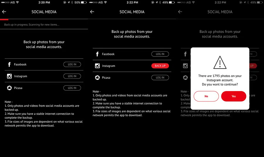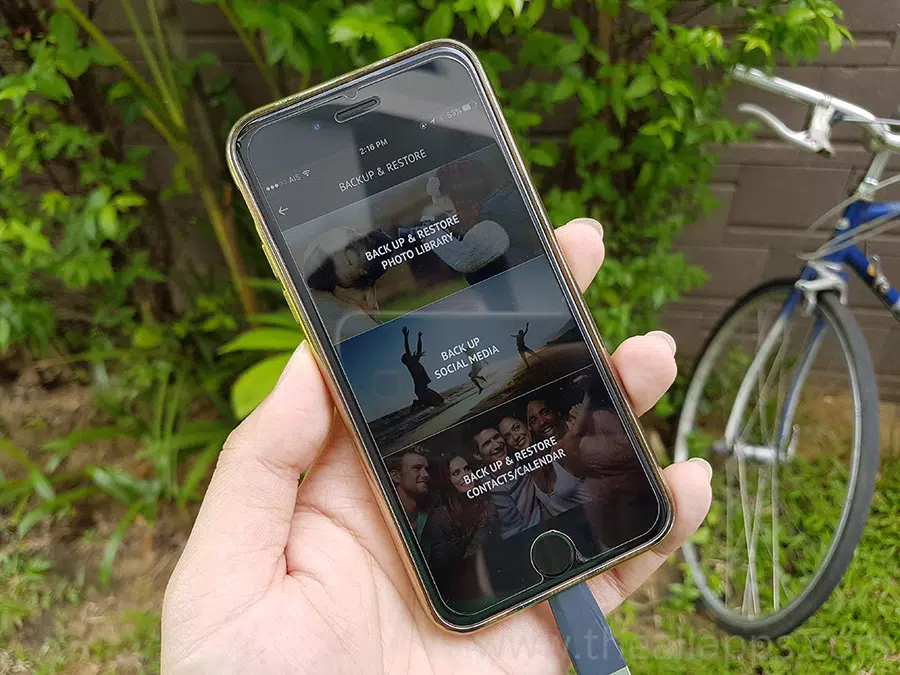 ภายในแอปพลิเคชั่น SanDisk iXpand Drive นั้นมีฟีเจอร์สำรองข้อมูลอัตโนมัติมาให้ โดยสามารถสำรองข้อมูลรูปภาพ, วิดีโอ, รายชื่อ, นัดหมายปฏิทิน และสามารถสำรองข้อมูลรูปภาพจาก Facebook, Instagram และ Picasa ได้อีกด้วย