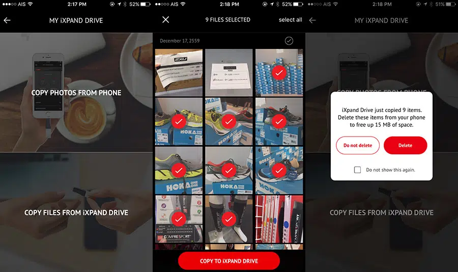 ซึ่งหากมีการก็อปปี้ไฟล์จาก iPad, iPhone ไปเก็บไว้ยังแฟลชไดร์ฟ ตัวแอปพลิเคชั่นจะถามว่าต้องการให้ลบไฟล์ที่ย้ายมาเลยหรือไม่ โดยจะคำนวนพื้นที่จะที่ว่างขึ้นหากเราลบไฟล์เหล่านั้นออกไปมาให้ด้วย