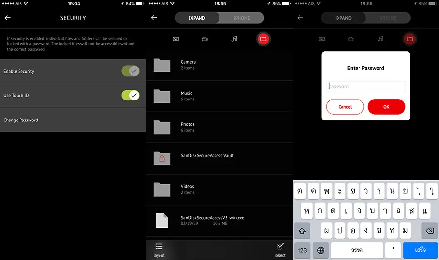 แฟลชไดร์ฟ SanDisk iXpand Mini นั้นมาพร้อมกับความปลอดภัยและความเป็นส่วนตัว สามารถเปิดการใช้งานการเข้ารหัสของโฟลเดอร์เพื่อป้องกันข้อมูลส่วนตัวของคุณในกรณีที่แฟลชไดร์ฟอยู่กับเพื่อนหรือบุคคลอื่น ในการใช้งานก็เพียงแค่เข้าไปเปิดการใช้งานของการเข้ารหัสและตั้งรหัสผ่านในการตั้งค่าของแอปพลิเคชั่น จากนั้นจะมีการสร้างโฟเดอร์ SanDiskSecureAccessVault ขึ้นมาให้ และในการเปิดโฟลเดอร์นี้เราจะต้องทำการใส่รหัสผ่านเข้าไป หรือจะใช้ Touch ID สแกนลายนิ้วมือเพื่อความสะดวกในการเข้าถึงโฟลเดอร์เหล่านั้นได้ เพียงแต่ต้องตั้งการเปิดใช้งาน Touch ID ก่อน
