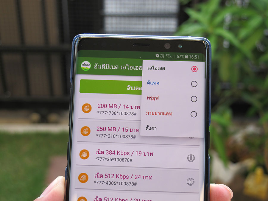 แต่ถ้าหากต้องการจะดูของเครือข่ายอื่น ก็สามารถแตะที่ 3 จุด มุมขวาบนเพื่อเลือกเครือข่ายอื่นๆ ได้เลย ซึ่งหากต้องการดูรายละเอียดของโปรเสริม โปรเน็ต หรือแพ็กเกจนั้นๆ ก็สามารถแตะเข้าไปดูได้