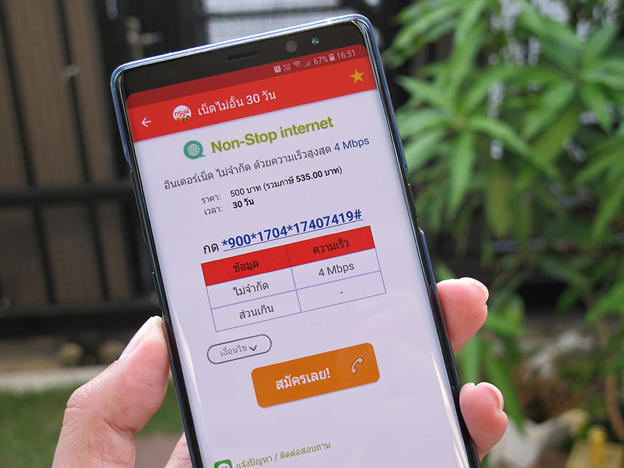 การใช้แพ็กเกจ เราจะเห็นชื่อโปรโมชั่นและรหัสการกดสมัคร แต่เราไม่จำเป็นต้องเปลี่ยนหน้าจอจากแอปพลิเคชันระหว่างหน้าโทรออกไปมาเพื่อกดตัวเลขตามเพื่อสมัคร ให้เลือกกดปุ่ม สมัครเลย (Subscribe Now) จากโปรที่เราต้องการสมัครได้เลย ซึ่งก่อนที่เราจะสมัคร ตัวแอปพลิเคชันก็จะแสดงจำนวนเงินทั้งหมดที่รวมภาษี (VAT) ที่ต้องใช้ในการสมัครกับทางเครือข่ายผู้ให้บริการให้เห็นก่อนที่เราจะทำการยืนยันการสมัคร