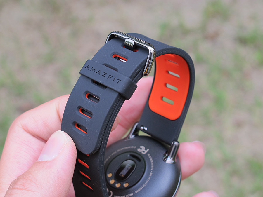 ตัวสายสามารถถอดเปลี่ยนหรือถอดออกมาเพื่อทำความสะอาดได้ง่าย เพียงแค่ดึงสลักออกมาก็สามารถถอดสายได้แล้ว แต่ก็ไม่หลุดง่ายในขณะสวมใส่ เพราะต้องใช้นิ้วไปเกี่ยวสลักเท่านั้น ถึงจะดึงออกมาได้ สำหรับสีที่ได้มาจะเป็นสายสีดำ ด้านในเป็นสีแดง และตัวเข็มขัดรัดสายยังเขียนคำว่า AMAZFIT ไว้ด้วย ส่วนใครที่ต้องการจะเปลี่ยนสาย ก็สามารถใช้สายขนาด 22mm ได้