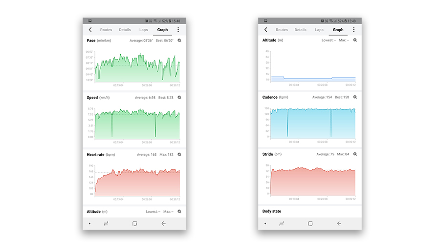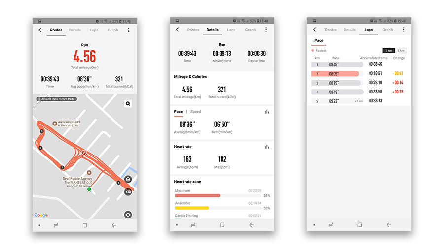 การออกไปวิ่งไม่ต้องยุ่งยากอีกต่อไป เพราะ AMAZFIT PACE นั้นมี GPS ภายในตัว และมีพื้นที่จัดเก็บข้อมูล สามารถใส่เพลงเข้าไปในนาฬิกา เชื่อมต่อกับหูฟังบลูทูธ ก็สามารถวิ่งไป ฟังเพลงไปได้แล้ว ไม่จำเป็นต้องพกสมาร์ทโฟนออกไปด้วย โดยการวิ่งออกกำลังกายนี้ นาฬิกาจะทำการเก็บข้อมูลมาแสดงผลเป็นกราฟต่างๆ ในแอปพลิเคชัน ซึ่งสำหรับนักวิ่งแล้ว ข้อมูลก็ค่อนข้างมีให้ครบเลย ไม่ว่าจะเป็น Heart rate zone, รอบขา (Cadence), ระยะก้าว (Stride), ระยะทาง (Distance), ความเร็ว (Pace), Laps และเส้นทางการวิ่ง ซึ่งแน่นอนต้องยกความดีความชอบให้ GPS ที่อยู่ในตัว