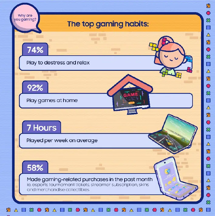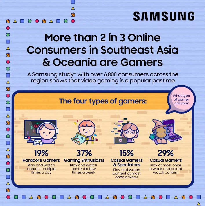 ซัมซุงเผยผลการวิจัยเชิงลึกด้านการเล่นเกมของผู้บริโภคในตลาดเอเชียตะวันออกเฉียงใต้และโอเชียเนีย พบว่า 7 ใน 10 ของผู้บริโภคออนไลน์ ในภูมิภาคนี้เป็นเกมเมอร์ ซึ่งซัมซุงทำการสำรวจนี้ร่วมกับวันอีสปอร์ตโดยสำรวจผู้บริโภคมากกว่า 6,800 คนที่มีอายุระหว่าง 18-49 ปี ใน 7 ประเทศ ได้แก่ ออสเตรเลีย อินโดนีเซีย มาเลเซีย ฟิลิปปินส์ สิงคโปร์ ไทย และเวียดนาม ในช่วงไตรมาสสุดท้ายของปี 2565[1] ซึ่งแสดงให้เห็นถึงความรักในการเล่นเกมอย่างกว้างขวางไม่ว่าจะที่บ้านหรือนอกสถานที่