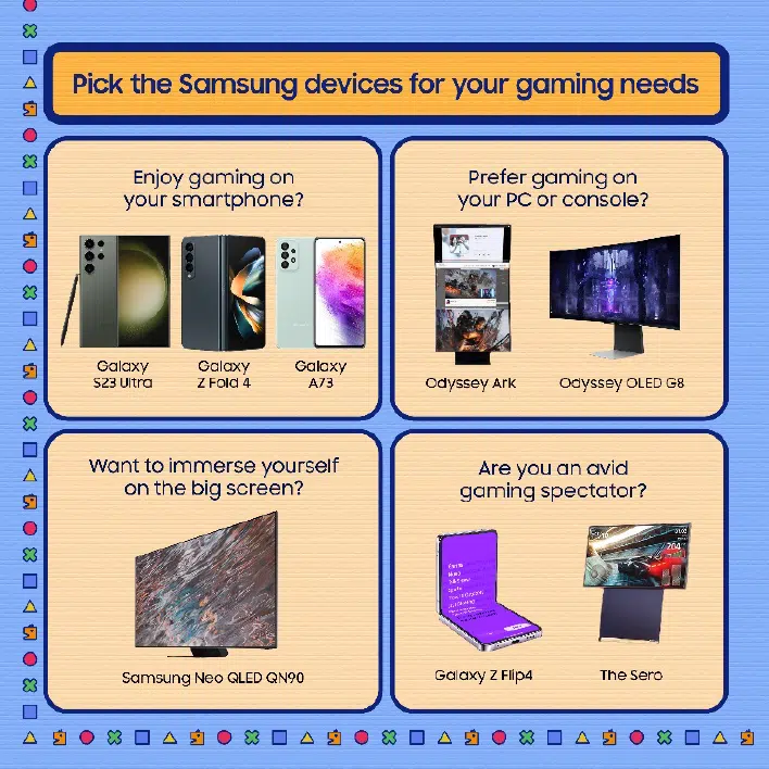 ผู้ชื่นชอบเล่นเกมบนพีซีและเกมคอนโซลสามารถเลือกใช้จอมอนิเตอร์ที่ประสิทธิภาพดีที่สุดของซัมซุงได้หลากหลายรุ่นทั้งรุ่น Odyssey Ark และ Odyssey OLED นอกจากนี้เกมเมอร์ที่ต้องการประสบการณ์การเล่นเกมที่ดีที่สุดบนหน้าจอขนาดใหญ่สามารถเลือกใช้ Neo QLED ทีวีอีกด้านหนึ่ง ผู้ที่ชอบชมเนื้อหาเกี่ยวกับเกมสามารถเลือกใช้ Samsung Galaxy Z Flip4, Smart Monitor M8 และ The Sero