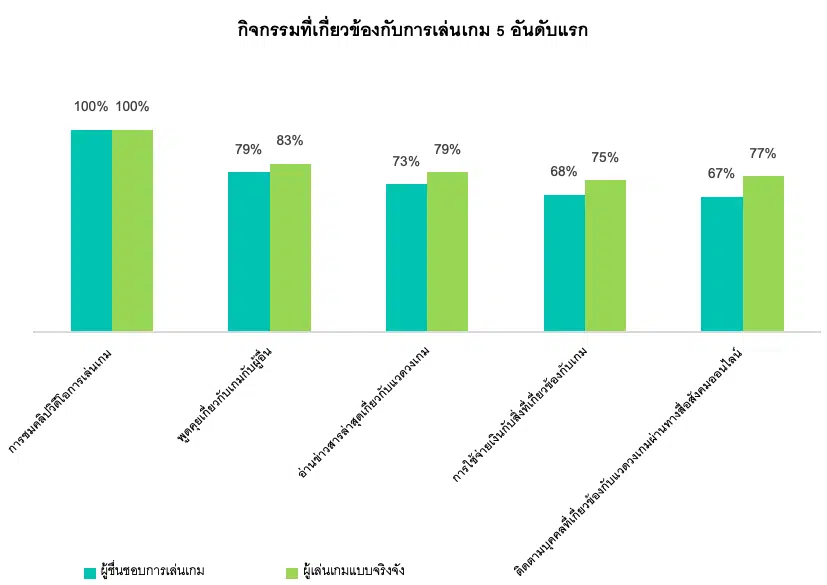 การเล่นเพื่อลดความเครียดและผ่อนคลายถือว่าเป็นเหตุผลหลักในการเล่นเกมถึง 74% โดยใช้เวลาเล่นเกมเฉลี่ย 7 ชั่วโมงต่อสัปดาห์ ผู้เล่นเกมส่วนใหญ่ (92%) ชอบเล่นเกมที่บ้านและผู้บริโภคมากกว่าครึ่ง (58%) ใช้จ่ายเฉลี่ย 30 ดอลลาร์สหรัฐฯ ต่อเดือนในการซื้อสิ่งที่เกี่ยวข้องกับการเล่นเกม เช่น เนื้อหาพิเศษออนไลน์ บัตรเข้าชมการแข่งขันอีสปอร์ต สมัครสมาชิกของสตรีมเมอร์ ซื้อสกิน และซื้อของสะสม