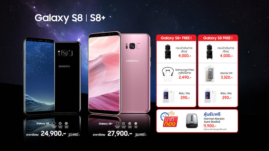 - ลูกค้าที่ซื้อ Note8, S8 / S8+ ภายในงาน Thailand Mobile Expo มีสิทธิ์ร่วมกิจกรรมนาทีทอง เพื่อลุ้นรับ ลำโพงบลูทูธ Harman Kardon Aura Studio2 มูลค่า 11,900.- จำนวน 160 เครื่อง