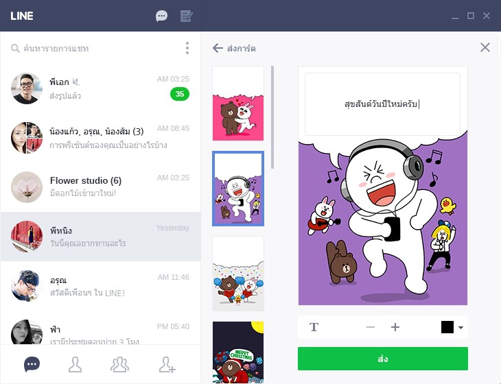 ก่อนหน้านี้ไม่นาน LINE ได้เปิดให้สามารถใช้งานแชท, ส่งรูปภาพได้บนเบราเซอร์ Google Chrome โดยที่ไม่ต้องติดตั้งแอพพลิเคชั่นเพิ่มเติม และในช่วงเทศกาลเช่นนี้ LINE Chrome (LINE สำหรับใช้งานผ่านเบราเซอร์ Google Chrome) มีของขวัญพิเศษกับฟีเจอร์ “ส่งการ์ด” ฟีเจอร์ใหม่พร้อมให้คุณส่งการ์ดลายน่ารักๆ ตกแต่งด้วยคาแรคเตอร์ LINE Friends กว่า 58 แบบกันเลยฟรีๆ