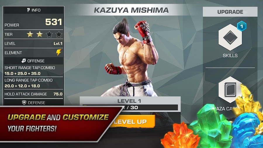 สำหรับตัวเกมนี้ นำโดยตัวละครอันคุ้นเคยอย่าง PAUL, KAZUYA, XIAOYU, LAW, PANDA, NINA และนักสู้อื่นๆ อีกมากมาย ภายในเกมสามารถอัพเกรดชุดตัวละครและใส่ทักษะพิเศษได้ และมีการปรับการควบคุมบนสมาร์ทโฟนได้ง่ายขึ้น รวมถึงการใช้คอมโบท่าต่างๆ ด้วย