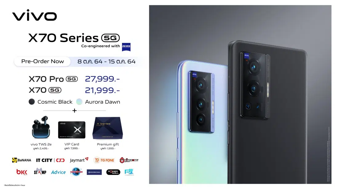 vivo X70 Pro 5G รุ่น RAM 12GB ความจุ 256GB เปิดให้สั่งจองได้ ที่ราคา 27,999 บาท และ vivo X70 5G รุ่น RAM 8GB ความจุ 128GB ที่ราคา 21,999 บาท พิเศษ! สั่งจองวันนี้รับทันทีหูฟัง vivo TWS 2e มูลค่า 2,499 บาท พร้อม VIP Card ประกันเครื่องและหน้าจอ มูลค่า 7,999 บาท และ Premium gift มูลค่า 1,999 บาท ที่ร้าน vivo Brand Shop ทุกสาขา รวมทั้งตัวแทนจำหน่ายทั่วประเทศ ไม่ว่าจะเป็น BaNANA, IT City | CSC, Jaymart, TG FONE, KINGKONG, BKK, Stamp, Advice, แม่วังสื่อสาร, BOONCHAI, Power Mall และ PTE ทุกสาขาทั่วประเทศ
