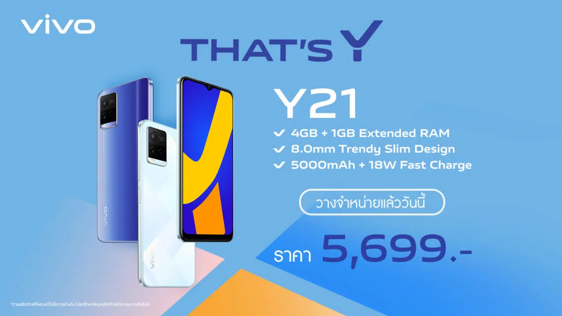 vivo Y21 RAM 4GB ความจำ 64GB พร้อมวางจำหน่ายอย่างเป็นทางการแล้วตั้งแต่วันนี้เป็นต้นไปที่ราคา 5,699 บาท ณ vivo Brand Shop ทุกสาขา ตัวแทนจำหน่ายทั่วประเทศ ผู้ให้บริการเครือข่าย และ ช่องทางออนไลน์ vivo Official Store ติดตามรายละเอียดเพิ่มเติมได้ที่ https://www.vivo.com/th