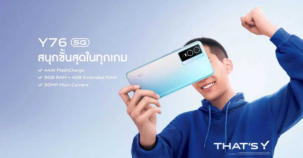 vivo แบรนด์สมาร์ตโฟนชั้นนำระดับโลก ส่งสมาร์ตโฟนรุ่นใหม่ล่าสุดในตระกูล Y Series กับ vivo Y76 5G สนุกขั้นสุดในทุกเกม ตอกย้ำความเป็นผู้นำสมาร์ตโฟนรองรับการเชื่อมต่อสัญญาณ 5G ภายใต้แนวคิด ‘That’s Y Enjoy the moment, Enjoy your life’ พร้อมเอาใจเหล่าเกมเมอร์กับชิปเซ็ตประมวลผล MediaTek Dimensity 700 แบตเตอรี่ความจุ 4100mAh รองรับเทคโนโลยีชาร์จไวถึง 44 วัตต์ RAM 8GB +4GB ให้สนุกขั้นสุดกับทุกเกมที่ชื่นชอบได้ตลอดทั้งวัน พร้อมถ่ายภาพคมชัดด้วยกล้องหลักความละเอียด 50MP พร้อมให้เป็นเจ้าของแล้ววันนี้ ในราคาเพียง 9,999 บาท รับฟรี Y Series Gift Set มูลค่า 899 บาท